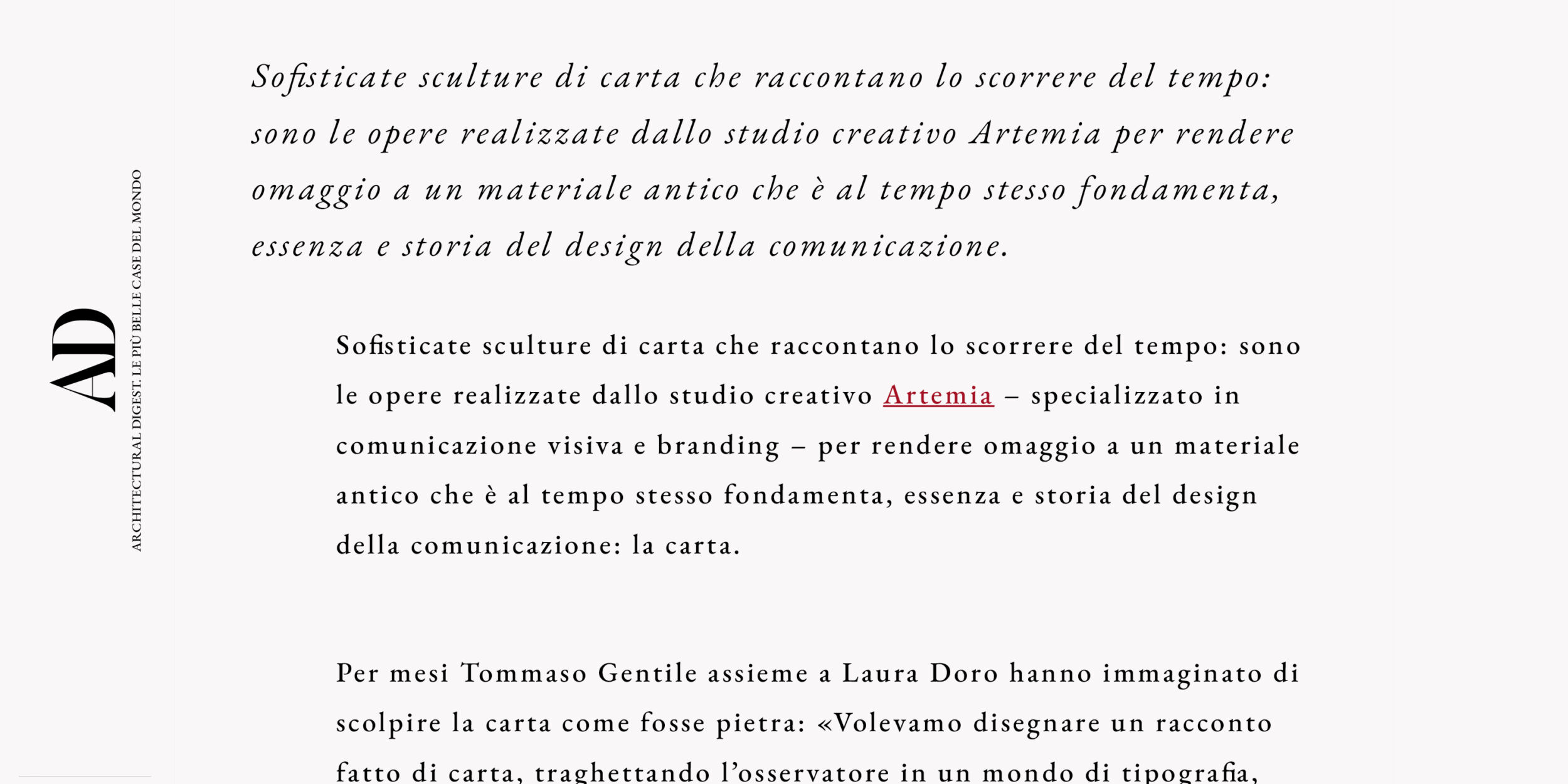 “Sofisticate sculture di carta che raccontano lo scorrere del tempo: sono le opere realizzate dallo studio creativo Artemia – specializzato in comunicazione visiva e branding – per rendere omaggio a un materiale antico che è al tempo stesso fondamenta, essenza e storia del design della comunicazione: la carta. Per mesi Tommaso Gentile assieme a Laura Doro hanno immaginato di scolpire la carta come fosse pietra: «Volevamo disegnare un racconto fatto di carta, traghettando l’osservatore in un mondo di tipografia, storia e atmosfere», raccontano i designer. Così sono nati i progetti Perpetuo! e Nanetto.” Scrive Gaia Passi che ringraziamo moltissimo, nel suo articolo su AD Italia dedicato a Perpetuo! e Nanetto!